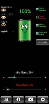 With the Battery alarm application, you can check the status of your battery. All data is obtained from your phone (temperature, current, battery status, etc ..) percentage of battery charge, battery health, current battery temperature, current battery voltage.