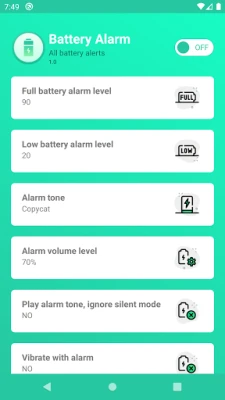 Battery Alarm notifies you when your battery is fully charged or when battery is low.