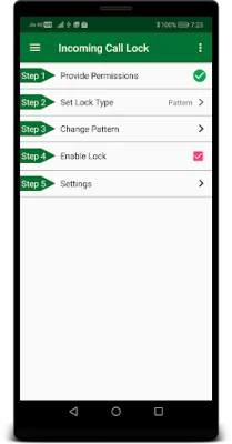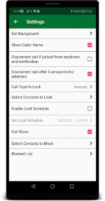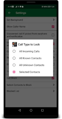 ** Enable/Disable Incoming Call Lock ** You can select pattern lock or password lock as a lock screen. ** No one can talk to your incoming calls by picking the calls using earphones. ** Auto Disconnect Call if tried with wrong password three times. ** Caller Type Lock Settings : All, Known, Unknown, Selected ** Show Name Setting ** Call Blocking ** Call Lock Prevention to be killed by the processor. ** Lock Screen Background can be chosen from gallery or given 6 backgrounds. ** Pattern visibility settings. ** Fingerprint Unlock