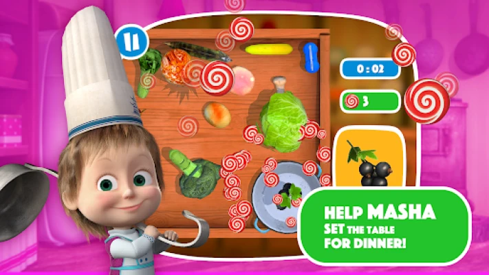 Silly Wolf, Rosie the Pig, Rabbit, and Penguin visit Masha and ask her to feed them. Each brings fresh ingredients - more than 50 types in total - from which Masha must prepare tasty food and deliver it. As a reward for completed tasks, the guests give Masha new products to make more dishes and medals to unlock stylish chef outfits. Children can explore different recipes, test various cooking tools, and learn how different ingredients combine to create delicious meals.