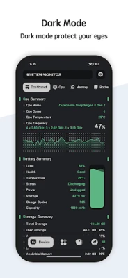 System Monitor for cpu and memory and battery. You can monitor cpu temperature and frequency at the same time. System Monitor show the cpu detail information including: cpu name, cpu core counts and cpu frequency. The cpu overheating protection will show the toast when cpu temperature is too high. Detail feature list:
