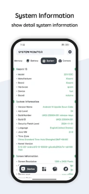 Show the detailed device information, including: cpu information, system information, hardware information, screen information .